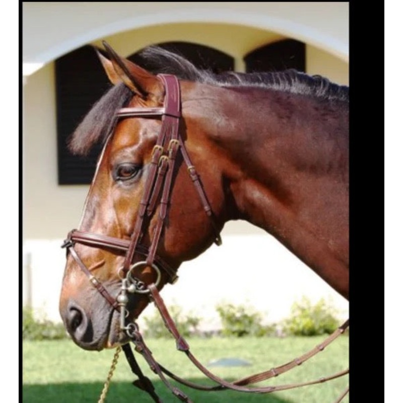 Double bridle in English leather with anatomic headpiecePadded, square raised flash noseband with removable nose strapPadded, slightly raised and fancy stitched browbandReins sold separately