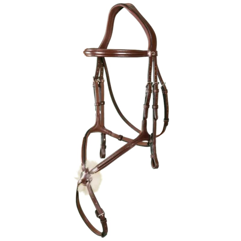 Matching stitching and silver hardware. Slightly square- raised browband and noseband with decorative topstitching. Figure 8 noseband without rings for greater comfort over the facial crests.
