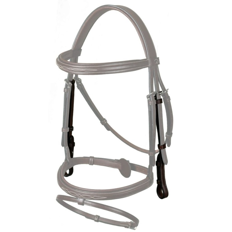 Cheek pieces in English leatherRegular length for Hunter Collection bridlesCream stitchingStainless steel hardware.Available in black or brown, pony, cob, and full.