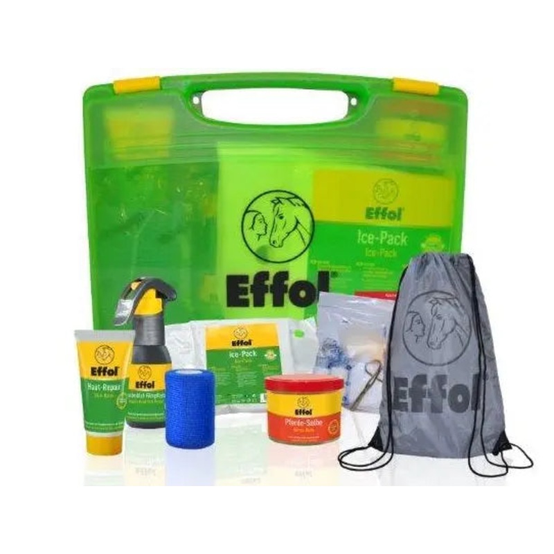 First Aid for you and your horse!This small and practical First-Aid Kit is a reliable basic companion to have with you in thecar, horse trailer or tack trunk, just-in-case. It contains classic wound care and first aid products from Effol as well as an elas