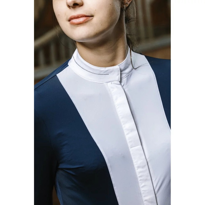 Featuring a white collar, an essential detail of competition attire, the EQUITHME Julia Show Shirt is adorned with a discreet line of rhinestones on the collar and the cuffs.