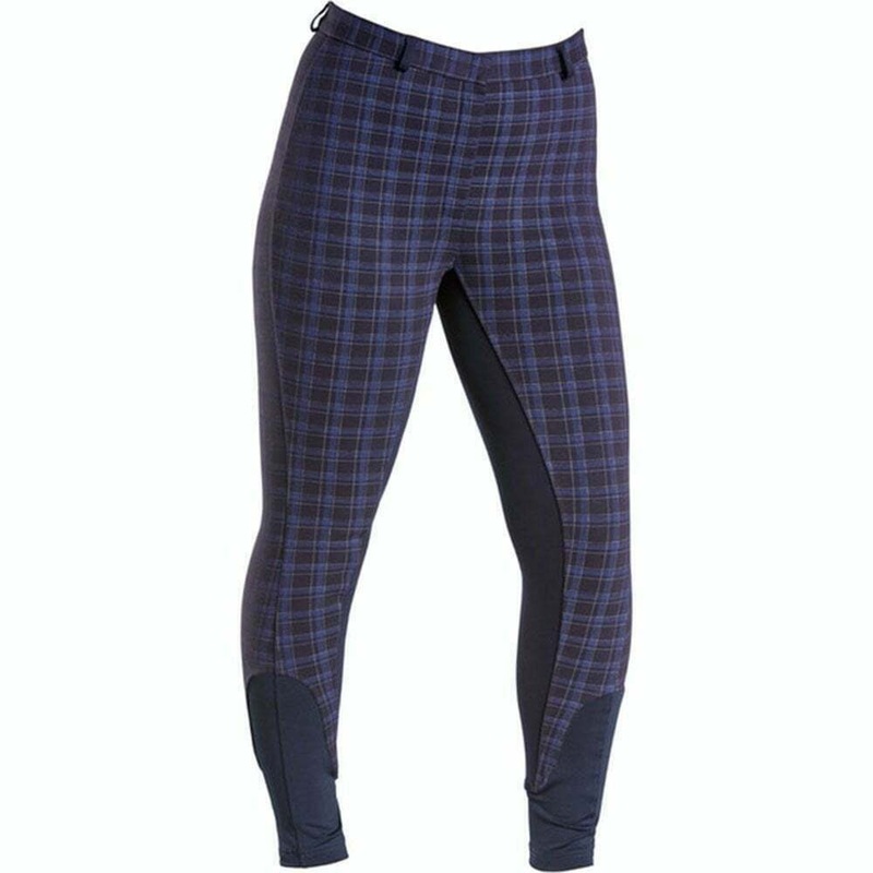 Great value printed Ladies checked breeches with hook and bar fastening, Firefoot text branding on rear and stretchy lycra ankles.