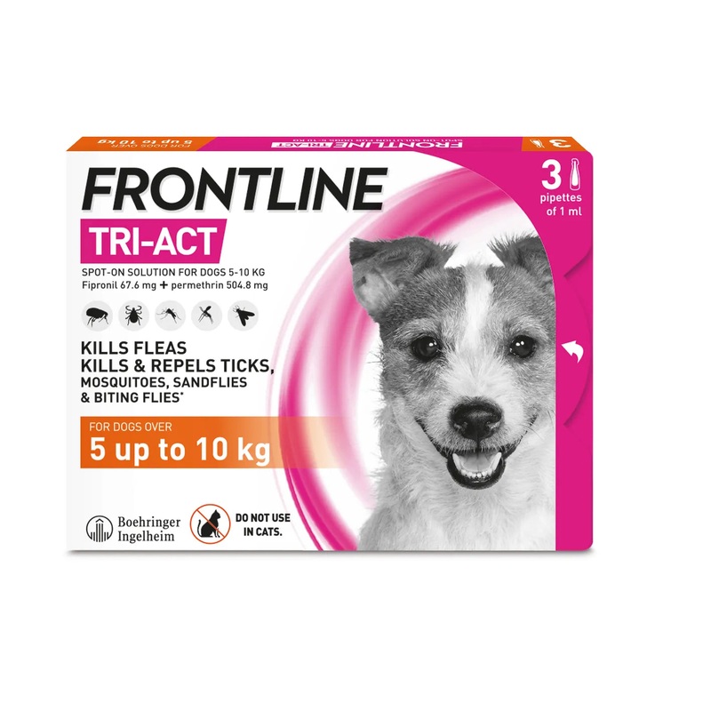FRONTLINE Tri-act FOR DOGS has a unique formula that kills faster and repels more disease-carrying parasites than the next leading competitor brand. Used every 4 weeks it is the next level in parasite control for dogs providing long-lasting protection against flying insects as well as fleas and ticks whilst also preventing home flea infestations.