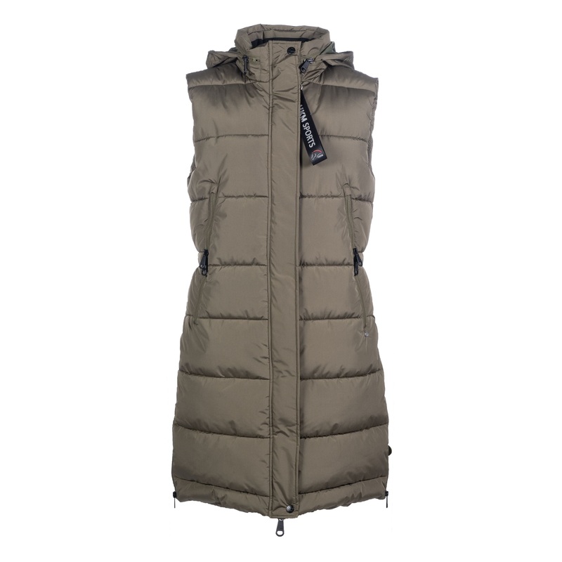 water resistantpadded long waistcoat with quiltingstand-up collar inside with warm fleecezipped collar with hidden hoodtwo-way zip at the front with trimlarge zipped pockets open upwards and downwardspockets with warm liningright pocket with elastic hook f