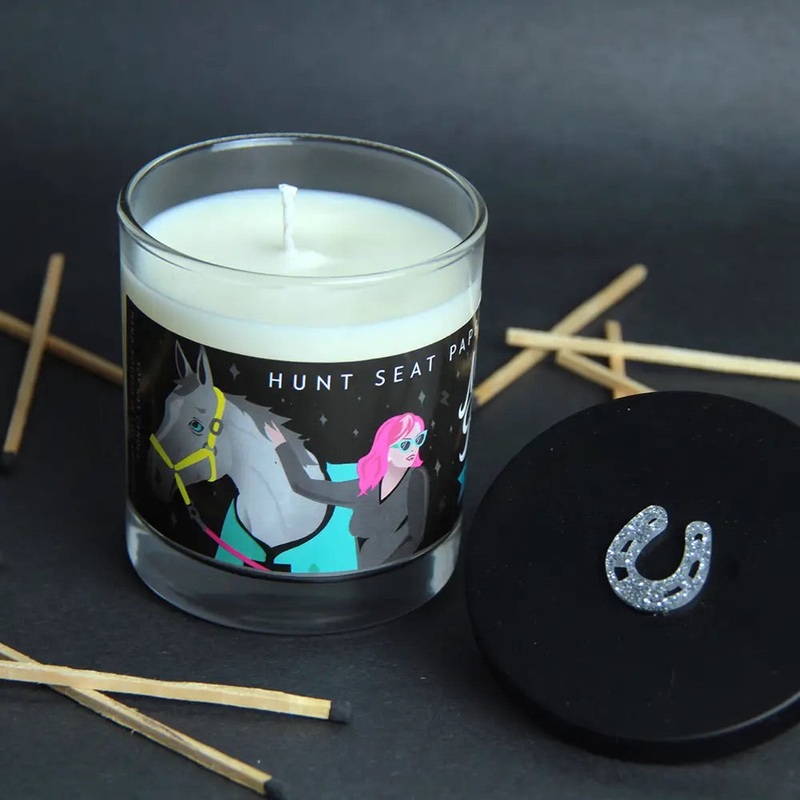 11oz Hand-poured soy candle, Apple + Maple Bourbon scent in a glass jar with black metal lid...blinged out with a sparkly horse shoe.Made in United States of America