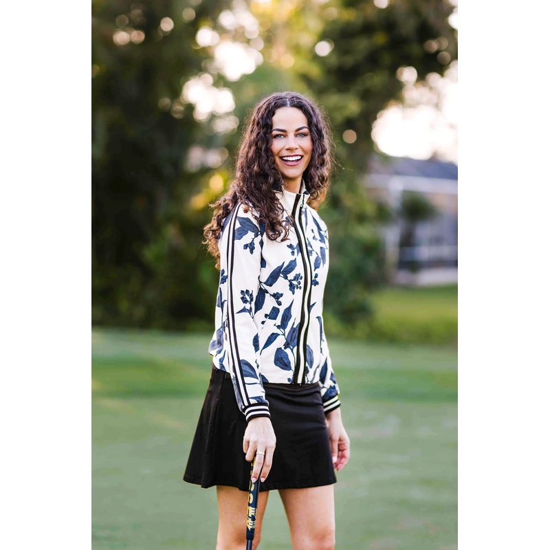 Ready, set, go! This seasons track jacket will take you from the barn, the green, the court and beyond. Featured in our lithograph leaf print, this soft, midweight track jacket is both contemporary and very practical. Two front pockets, black and white stripe details down the sleeves, at the cuffs and framing the full zipper, UPF 50.