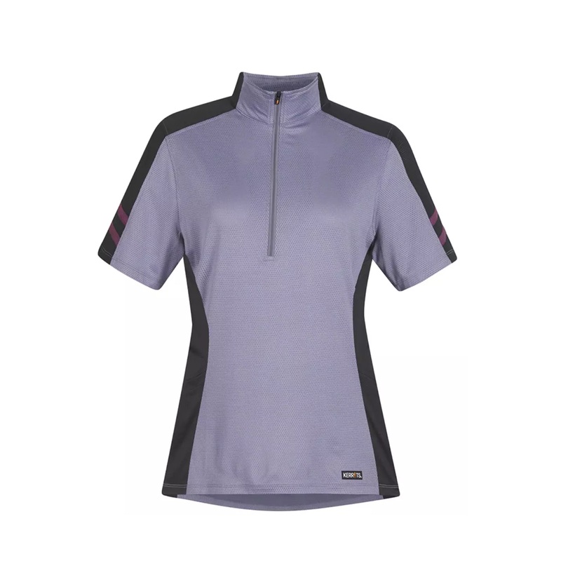 Prints keep it fun (and hide dirt) while Ice Fil delivers serious cooling power in a whisper light performance shirt that protects you from the sun with UPF+30 and a tall stand-up collar. Shorter, nine-inch sleeves and generous zip boost ventilation. Sporty, feminine fit and contrast side panels flatter, and match your favorite Kerrits tights and breeches. Handy side pockets let you pack lip stuff and horse cookies.