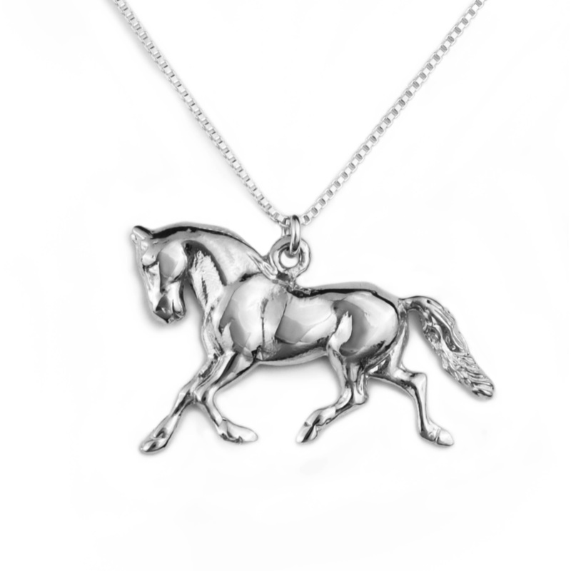Equestrian Dressage Horse Necklace shows off a horsein an extended trot. It beautifully showcases the energy and fluidity of the discipline. Solid cast, handmade in tarnish-resistant sterling silver. Different chain styles and lengths are available.925 Ste