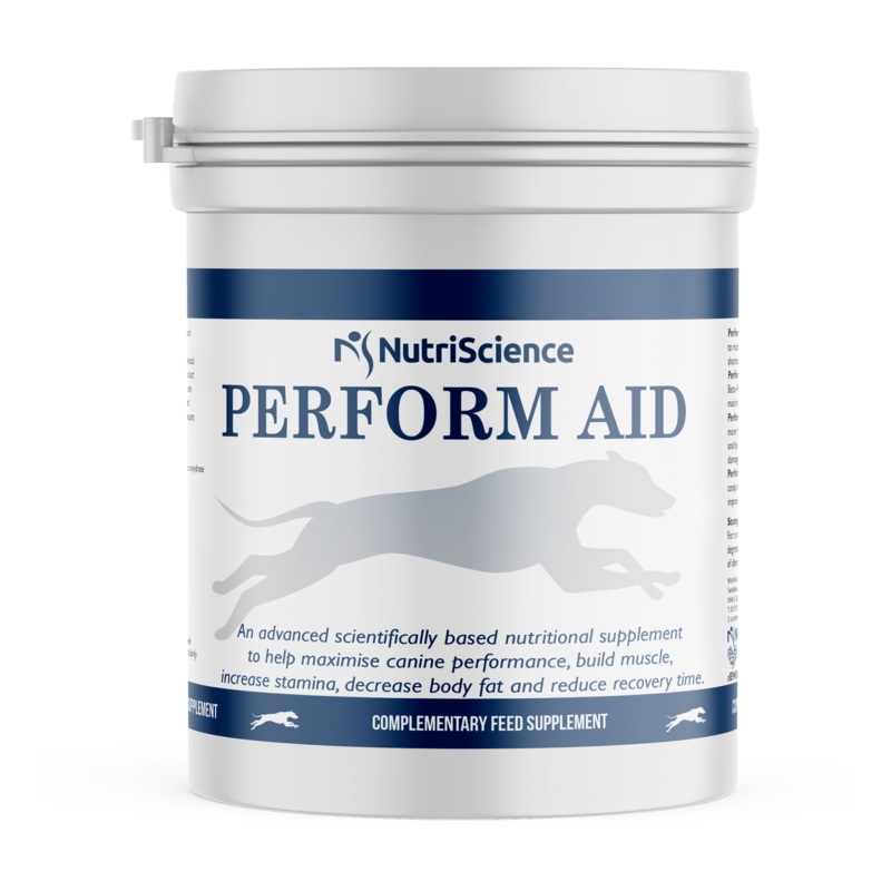 Perform Aid is a scientifically designed nutritional supplement to help maximise performance, build muscle, increase stamina, decrease body fat and reduce recovery time. Ideal for racing greyhounds and performance dogs to help maintain optimum muscle health and to prevent muscle damage.