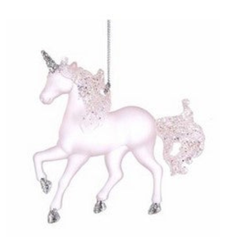 Kurt Adler's pink unicorn ornament is a whimsical addition to your holiday dcor or Christmas tree. This ornament features a matte pink finish and glittered hooves, mane, tail and horn.