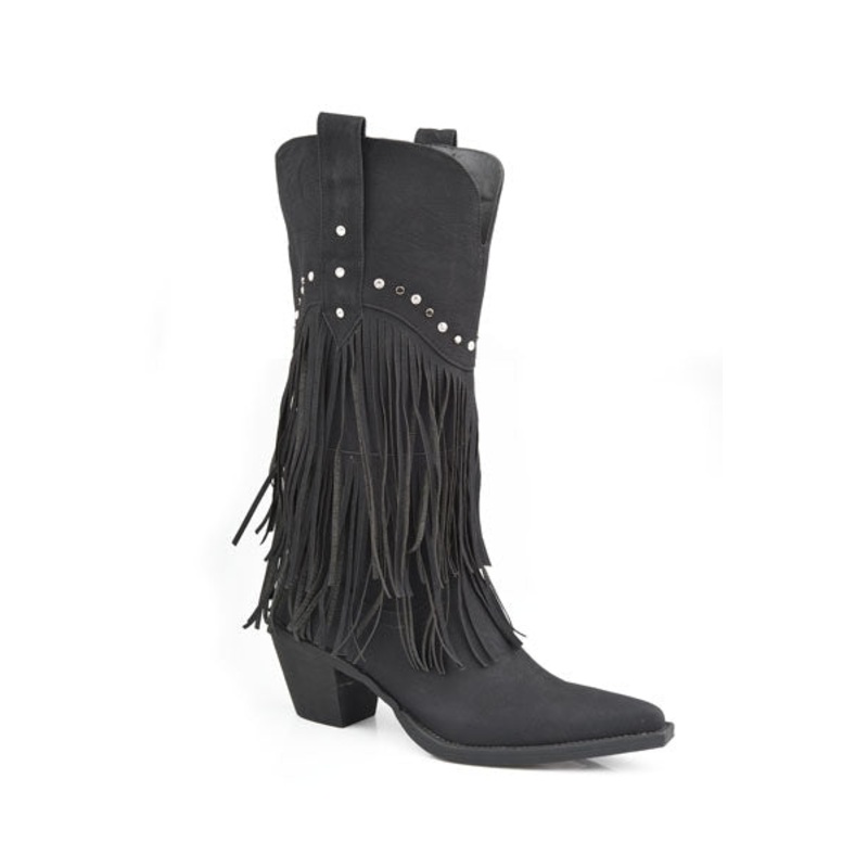 Distressed Faux Leather * Lightweight Flexible Bottom * 12 Inch Height * Pointy Toe Fashion Last * Padded Comfort Sock * Fringe And Stud Design On Shaft