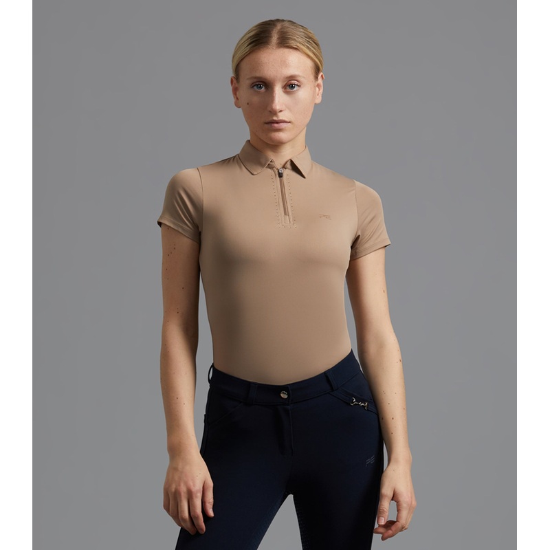 This highly breathable short-sleeved riding top is constructed from a hybrid material, offering soft-touch comfort and moisture wicking properties. A / zip allows for easy closure without the need for delicate buttons. Featuring a sophisticated shirt collar and subtle tonal gemstone embellishment which surrounds the zip closure.