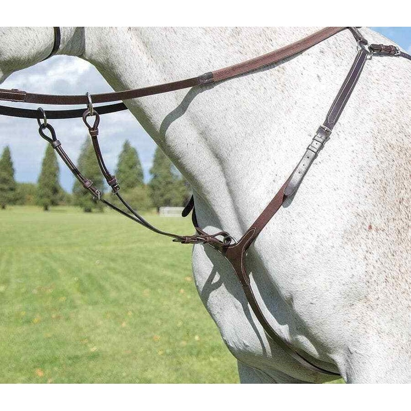 Adjustable at both sides of the shoulders and padded at the withers and chest for comfort with a detachable running martingale attachment. Stainless steel fittings.