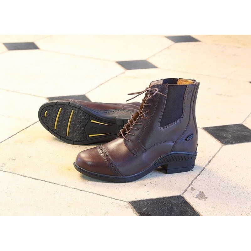 The Raffaele paddock boots by Moretta are the perfect riding partner for comfort and support in the saddle. Hand crafted from full grain leather with a high grade waxed finish and lined with soft leather, perforated for breathability. Anti-Shock Contoured Soles feature steel shanks to offer great arch support, reduce stirrup pressure and prevent muscle fatigue.Waxed laces, rear YKK zips, light padding around the elastic insert ankles, rot proof twin stitching for strength, punched leather detail, non-slip spur rests. CONTOUR-FLEX INSOLE* Three layer system with heel impact protection Anti-bacterial and response reflex zone Air cushion with arch support Stability shield with air vent technology *inspired by orthopaedic technology