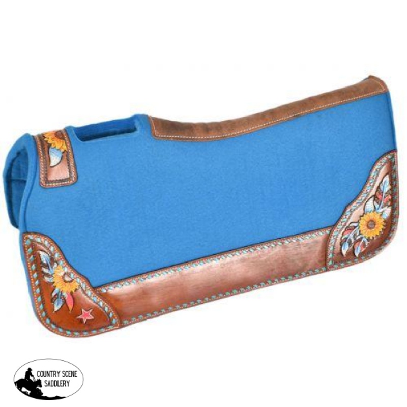 Showman31″ x 32″ x 1″ Turquoise felt saddle pad with hand painted sunflower, feather, and star design.This pad features 1″ thick, heavy duty turquoise felt with vented wither, leather reinforced spine and oversized wear leathers. Wear leathers are accented with hand painted sunflower, feather, and star design.PRE ORDER