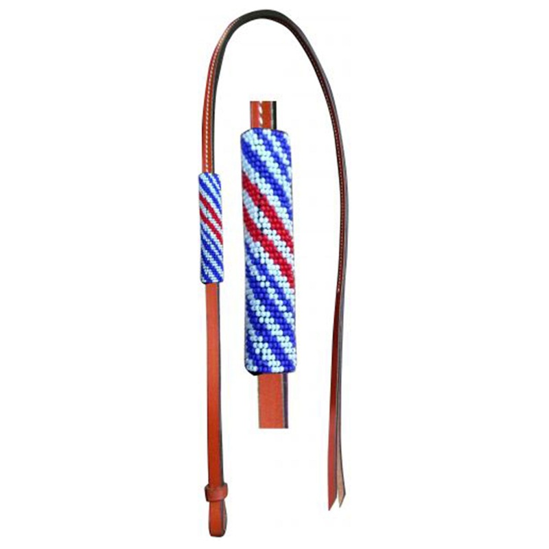 Showman 4ft Leather over & under whip with red, white, and blue beaded overlay. Measures 4′ long by 12 wide.var TabbedPanels1=new Spry.Widget.TabbedPanels(TabbedPanels1);