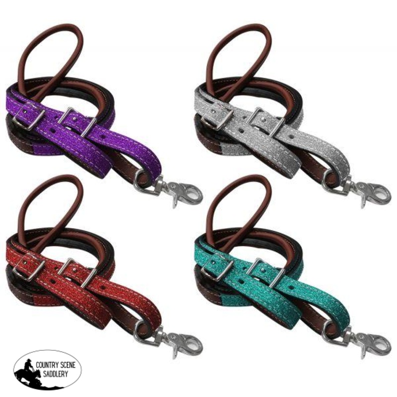 Showman 8ft Glitter leather contest reins. These reins feature medium leather rolled center and a glitter overlay with conway buckle and single scissor snap end.