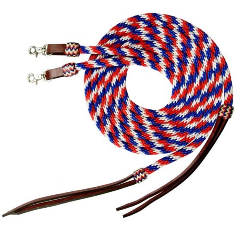 Showman 8ft Red, White, and Blue round braided nylon split reins with leather poppers. These nylon reins features braided red, white, and blue nylon with rawhide braided rawhide accents and leather poppers. Easily attach to bit with scissor snap ends.