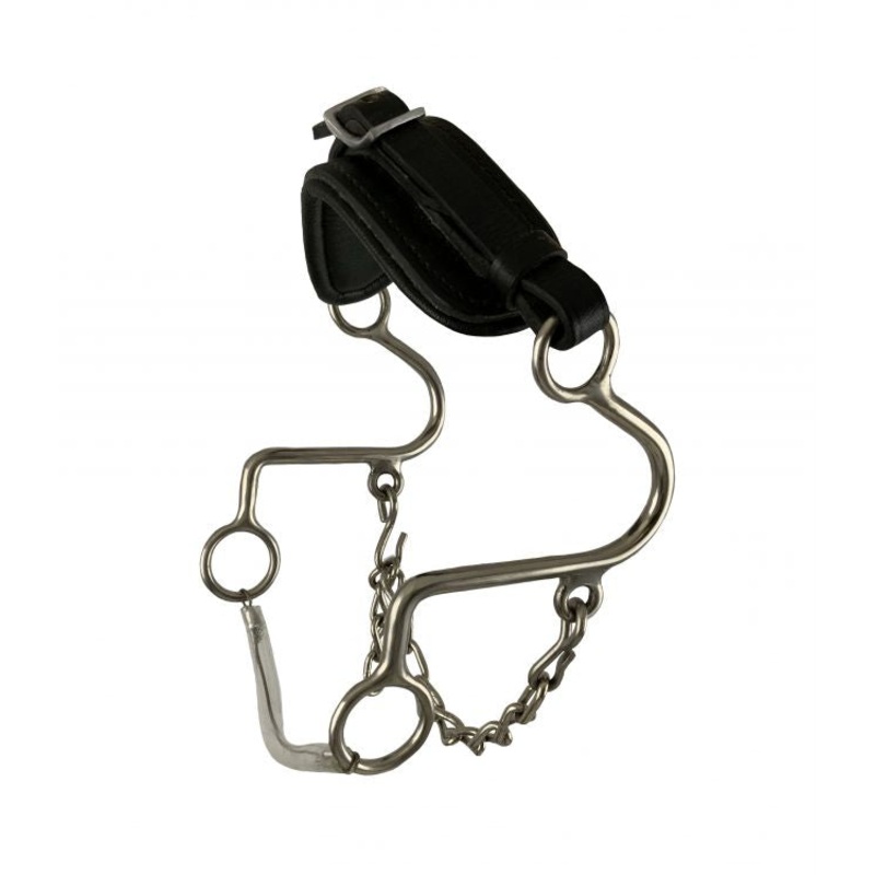 SFEC-58Showman Adjustable Leather Nose Stainless Steel Hackamore. This hackamore has an adjustable leather padded nose and 6" cheek with adjustable curb. With Rubber Coated Steel Cable Slobber Bar.