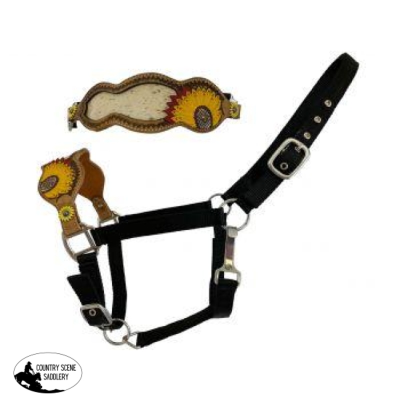 088Showmanadjustable nose nylon bronc halter with Nickle plated hardware and eyelets. Noseband features hair on cowhide inlay with painted sunflower accent and sunflower conchos Pre orders USA (subject to change)