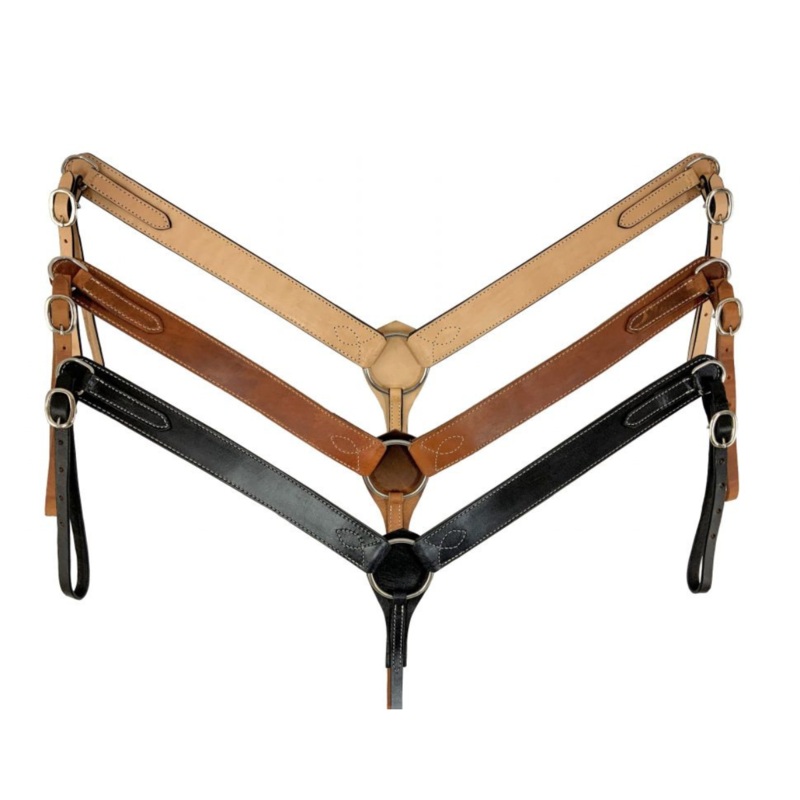 This Breast collar is double stitched and features leather tugs on each side. Measures approximately 2″ Wide.