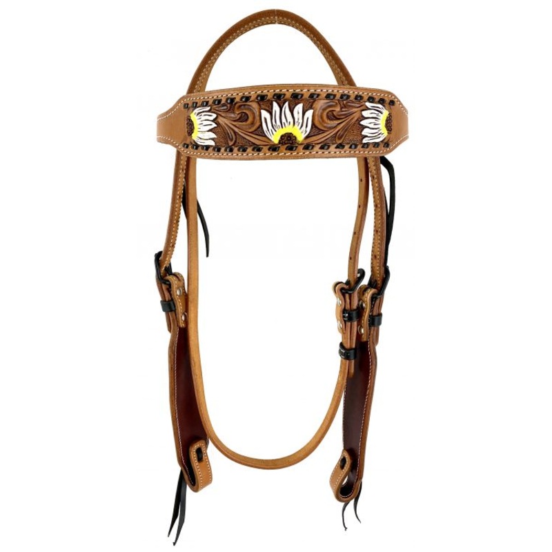 Showman Argentina cow leather browband headstall with hand painted sunflowers. This headstall features light brown colored Argentina cow leather and is accented with yellow hand painted sunflowers on cheeks and browband with a floral stamping and black lacing. Headstall has black hardware and features cowboy knot ties for quick change of the bit. Reins not included.Hardware is Stainless Steel.CLEARANCEThis is a CloseoutDiscontinued item. Sizes, colors and quantities are limited.No refundsNo exchanges on CloseoutDiscontinued items. Products are sold as is.var TabbedPanels1=new Spry.Widget.TabbedPanels(TabbedPanels1);