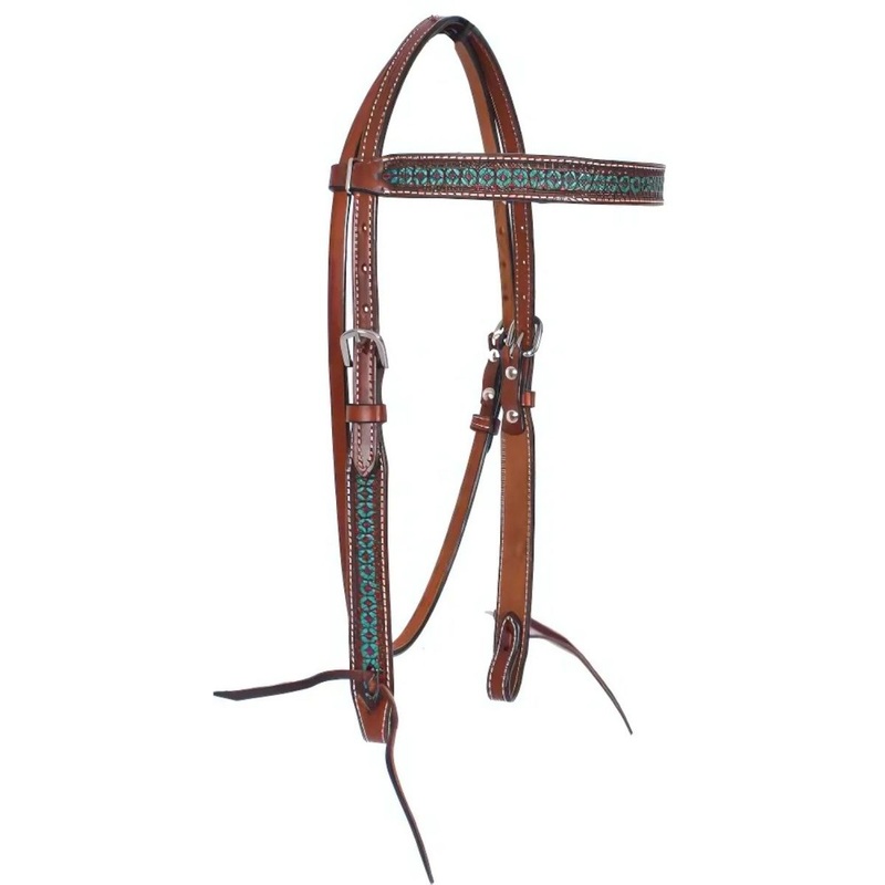 This headstall features quality medium oil Argentina cow leather with a turquoise tooling on cheeks and browband. Headstall is equipped with stainless steel buckles and leather tie bit loops.