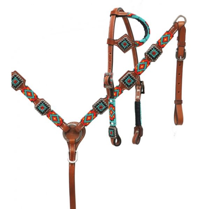 SF13724Showman Beaded headstall and breast collar set. This set features medium oil leather with a beaded teal, gold and black Navajo design overlay. Headstall comes with 5/8" x 7' leather split reins.