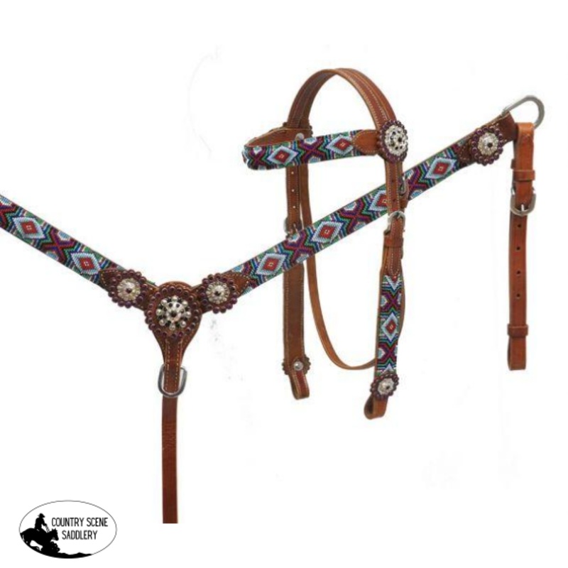 7015Showman Beaded headstall and breast collar set. This set features medium leather with a bright beaded overlay and is accented with rhinestone conchos. Headstall comes with 5/8" x 7' leather split reins.