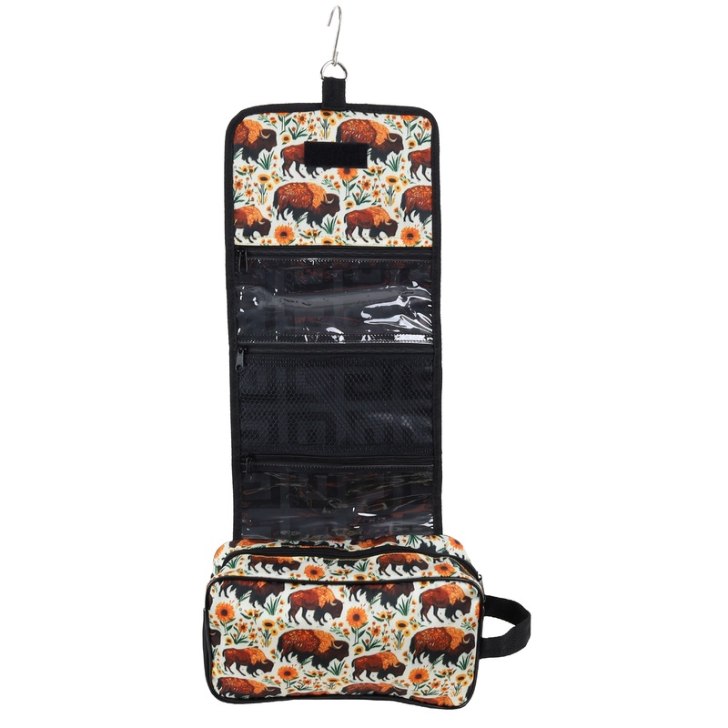 Add a splash of wild style to your routine with the Showman Bison Blooms Roll-Up Accessory Bag!Inspired by the wide-open plains, this bag features a bold and beautiful print of bison and bright yellow flowersperfect for cowgirls who want their gear as fierce as their ride. Whether you’re headed to a horse show, rodeo, or just organizing your everyday barn essentials, this roll-up bag is the ultimate blend of function and flair.Unroll it to reveal a spacious main compartment for your full-sized toiletries, along with multiple zippered pockets to keep your smaller items tidy and easy to find. From hair ties and cosmetics to travel-sized must-haves, there’s a place for everything. The Velcro roll-up design makes packing a breeze, and the built-in hook lets you hang it wherever you needshower, stall door, or towel rack.Compact, convenient, and seriously cute, this bag is a must-have for organized cowgirls on the go!Bison Blooms Print Features a Western-inspired bison and yellow floral design that adds bold style to your travel gear.Spacious Main Compartment Fits larger items like shampoo, lotion, or shaving cream with ease.Velcro Closure Roll-Up Design Rolls up and fastens securely for compact, easy transport.Two Clear Zippered Pockets Keeps smaller essentials visible and neatly organized.One Mesh Zippered Pocket Great for cosmetics, hair ties, or other travel accessories.Built-In Hook Conveniently hangs from a shower rod, towel rack, or stall door for quick access.Perfect for Travel or Everyday Use Ideal for horse shows, rodeos, weekend getaways, or barn life.Measures:11 x 6 x 3 (Rolled Up)Flap Measures:18 x 9 with 4 x 9 pockets.var TabbedPanels1=new Spry.Widget.TabbedPanels(TabbedPanels1);