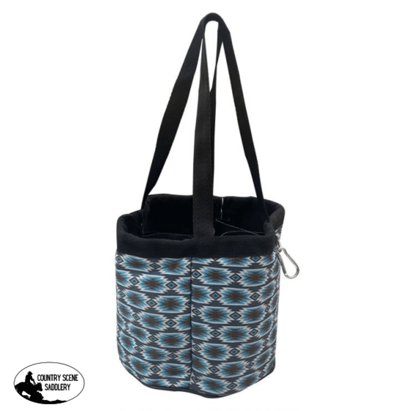 Showman Blue Aztec Print durable nylon grooming tote with 4 large pockets that fit most size brushes. Collapsible design for easy storage when not in use, 8″ deep. Great to keep around the barn or trailer.