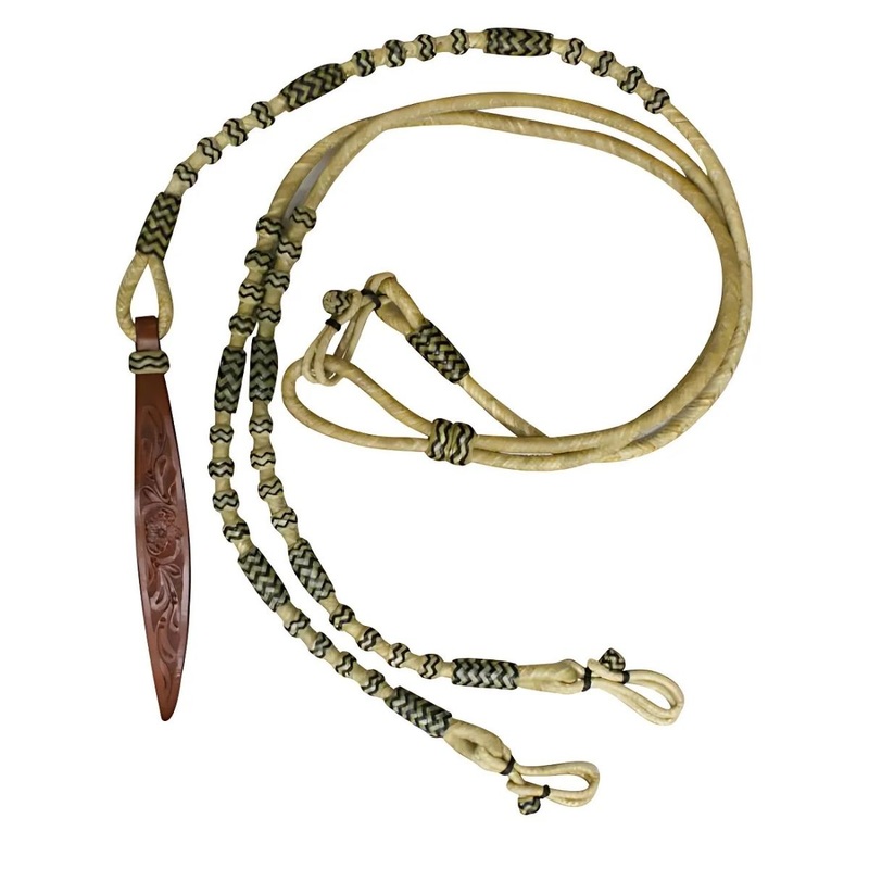 Showman Braided Natural Rawhide Romal Reins with Leather Popper. These reins feature supple natural rawhide with braided rawhide accents. 8′ x 1/4″ with 4′ quirt.
