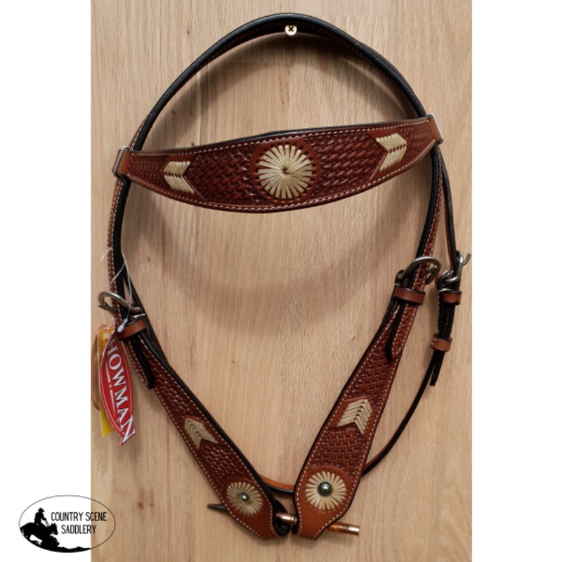 Showman Browband headstall with rawhide accent design made of Argentina Cow Leather. This headstall is medium in color with natural rawhide accents on the browband and cheeks. Features a basket stamp design and nickel hardware. REINS NOT INCLUDED