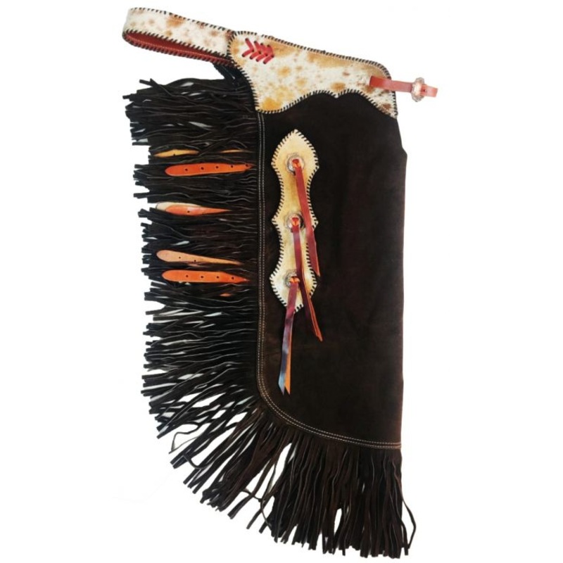 Showman Brown suede leather chinks with Hair on Cowhide Accent. Easily adjust with a three-buckle closure on each leg and an adjustable buckle front.Small:Waist 31.5 to 37.5Leg Circumference: 23 to 25Length (Hip to knee): 25Medium:Waist 35.5 to 39.5Leg Circumference: 23 to 27Length (Hipto knee):26Large:Waist 38 to 43Leg Circumference: 25 to 29Length (Hip to knee): 27var TabbedPanels1=new Spry.Widget.TabbedPanels(TabbedPanels1);