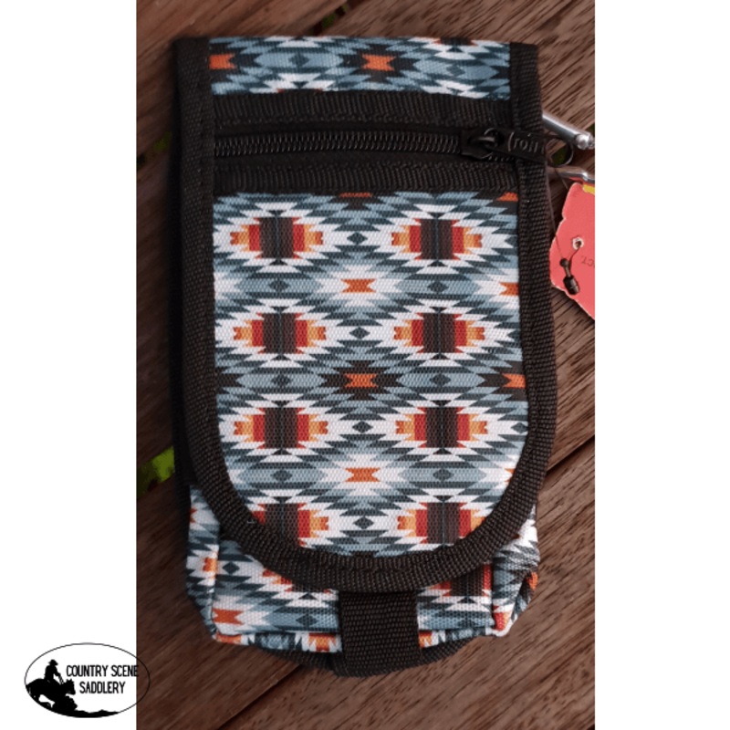 177766ShowmanGrey Aztecdesigncodura cell phone/accessory casewith velcro closure and zipper pocket. Has a clip or can be used with a belt. Made by Showman Products. Fits most phone sizes.Measures 4" x 7" folded