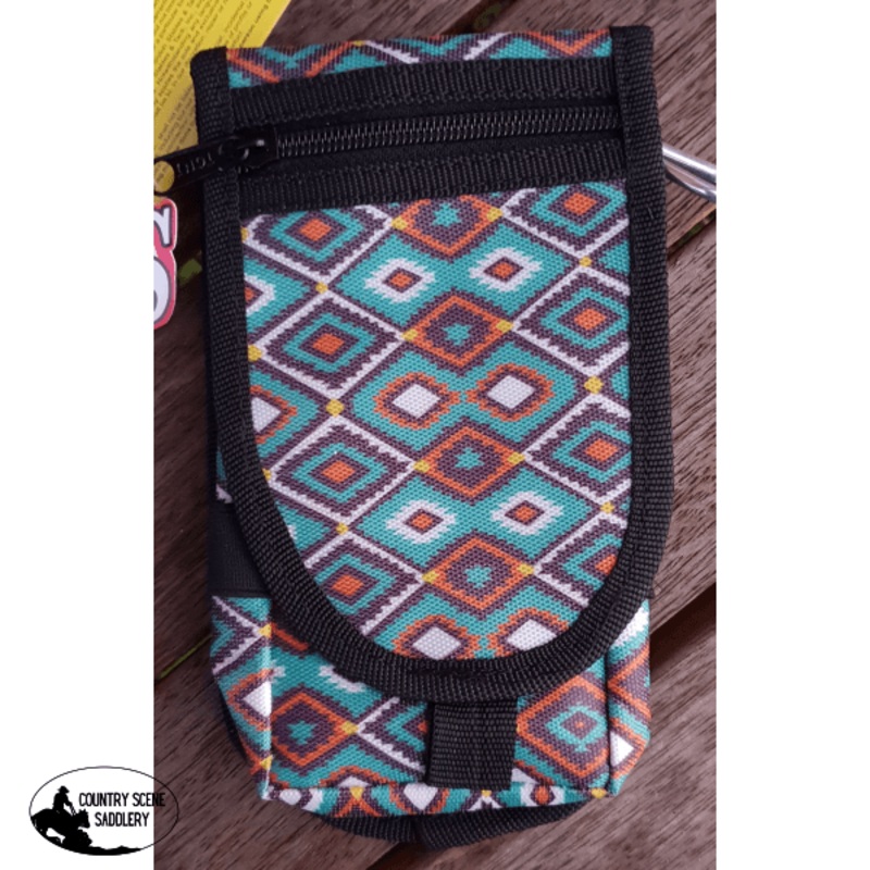 177758ShowmanTealAztecdesign coduracell phone/accessory case with Velcroclosure and zipper pocket. Has a clip or can be used with a belt. Made by Showman Products. Fits most phone sizes.Measures 4" x 7" folded