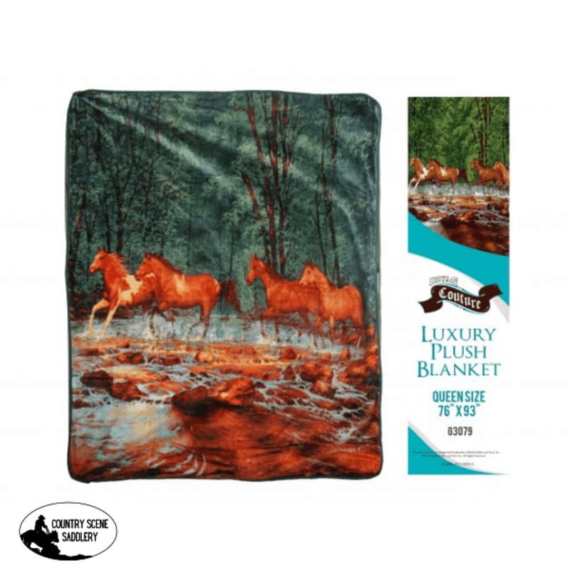Showman Couture Luxury plush blanket with running horses print. Queen Size 76″ x 93″. Queen Size 76″ x 93″. Soft luxury plush blanket features fine artistic images. 100% Polyester. Approx. 76″ x 93″.