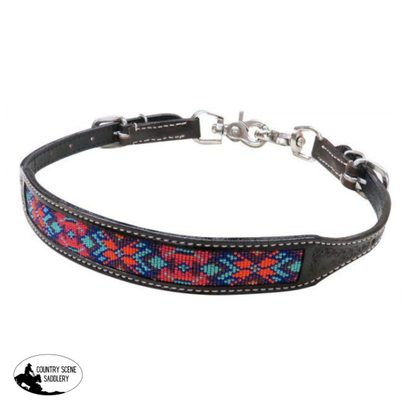19321 This wither strap features a multi color beaded inlay design on dark chocolate Argentina cow leather. Easily attach to breast collar with double scissor snap ends. Adjusts 23" - 29". Matching products #13741, #13746, #30839