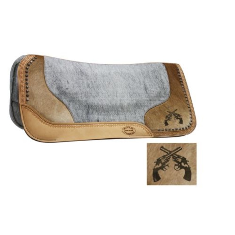 ShowmanFelt Bottom Saddle Pad. Hand Tooled Hair on Argentina Cowhide With Laser Etched Crossed Guns. Please note color of cowhide will vary.
