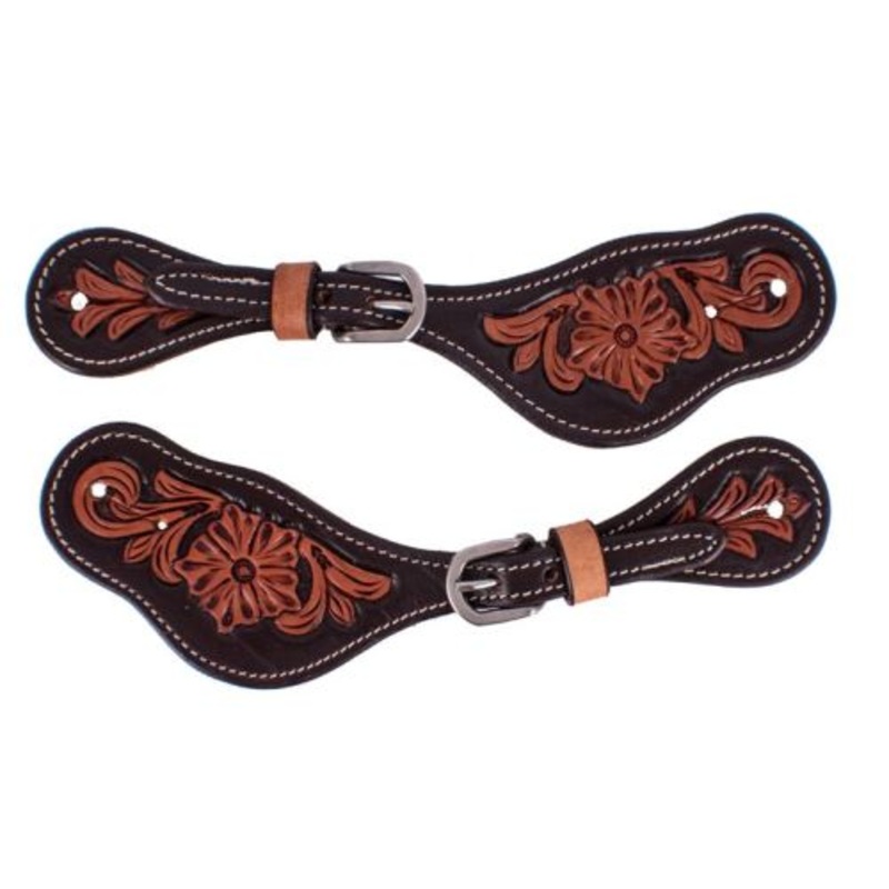 Showman LadiesArgentina two toned floral tooled spur straps. These straps feature dark brown leather with a medium floral tooled design.