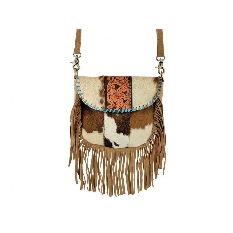 Showman Leather Crossbody Bag with hair on cowhide, teal lacing and fringe. This handbag features hair on cowhide and a tooled leather strip. Bag comes with an adjustable strap and a zipper pocket inside with a pouch. With Magnetic Closure. Measures Approx. 11 x 10**REAL COWHIDE- Patterns of cowhides canwill vary**var TabbedPanels1=new Spry.Widget.TabbedPanels(TabbedPanels1);