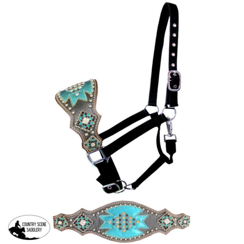 Showman Nylon bronc halter with grey leather noseband & teal accents and bling conchos.This black nylon halter features a grey nose band, accented with teal southwest design overlay accented and beading, features beautiful crystal rhinestones conchos.
