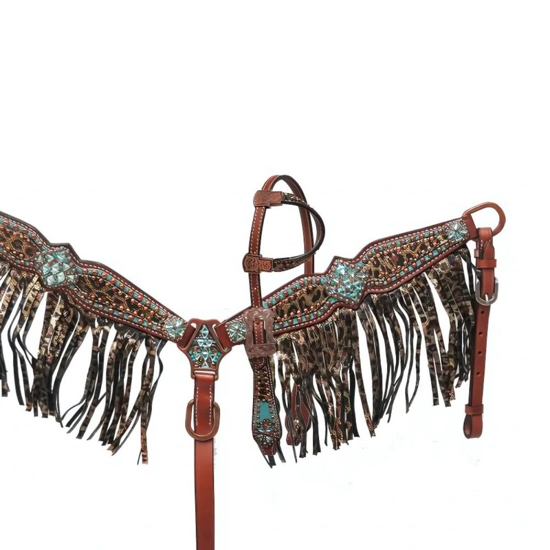 This set features medium leather with a metallic leopard print fringe and overlay with a turquoise textured leather and is accented with large bejeweled conchos and copper hardware. Headstall comes with 3/4" x 5' leather split reins.