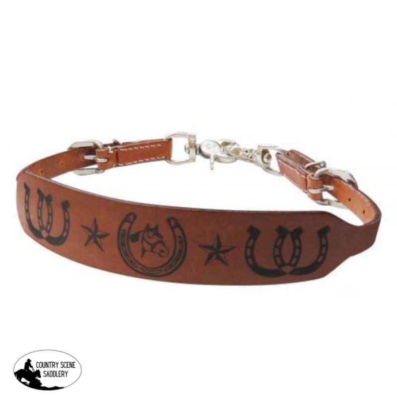 ShowmanPONY SIZEQuarter horsebranded wither strap.1.5″ wide with branded Quarter horse and horse shoe design.Attach onto breast collar with scissor snap ends. Easily adjusts 24″ to 19″ with nickel plated buckle.