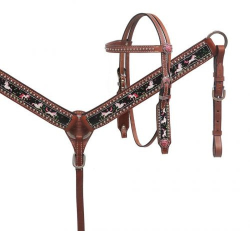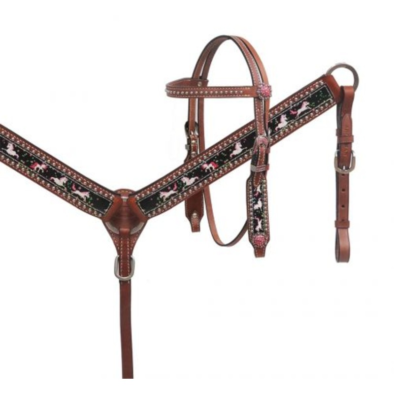This headstall and breast collar set features a unicorn print overlay design accented with crystal rhinestone hardware, conchos and silver studs. Headstall comes with 6ft leather split reins.Measurements:Headstall adjusts 29" -36" Bit loop to bit loop.Brea