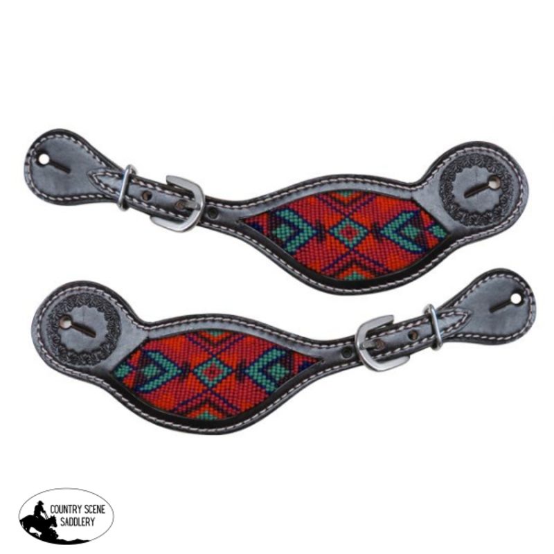 30892ShowmanLadiesHand painted arrow design spur straps. These spur straps feature dark brown leather with turquoise arrow tooling and a hand painted gold and white arrow. Accented with engraved copper conchos and copper studs.