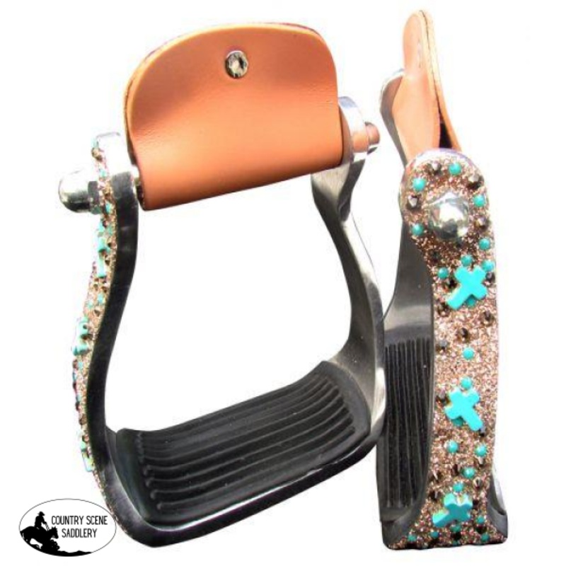 ShowmanTurquoise and Brown Cross Concho stirrups. This stirrup is accented with brown glitter and turquoise stone and brown crystal rhinestone studs with large turquoise stone cross conchos. This stirrup featuers lightweight aluminum with a rubber grip tread bottom.