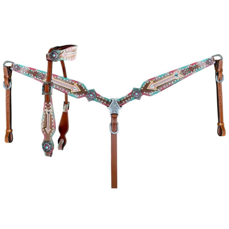 Showman Turquoise and pink inlay painted arrow design one ear headstall and breast collar set with matching accent conchos.