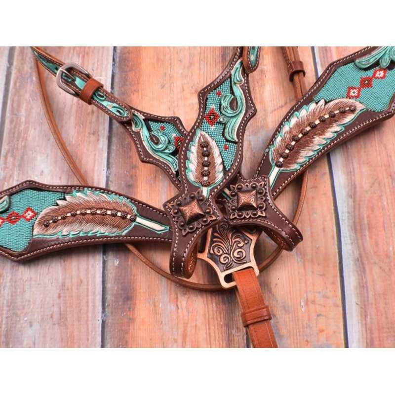 ShowmanTurquoise Beaded Browband Headstall and Breast Collar Set. This set features a turquoise and red diamond designed beaded inlay on headstall and breastcollar with a brown and turquoise hand painted feather. Set is medium brown in color with a dark brown leather overlay and is accented with copper conchos. Comes complete with 5/8″ x 7′ split leather reins.