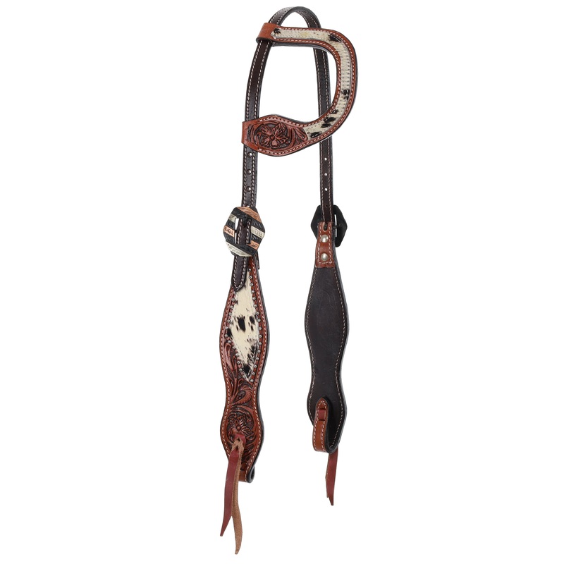 The Showman Western Luxe Series Iris One Ear Headstall is a stunning blend of quality craftsmanship and distinctive design. Made from medium oiled floral tooled leather, this headstall features a luxurious hair-on cowhide overlay, creating a refined look that stands out in any setting.Adorned with silver stud accents and dual silver and copper bar buckles, it exudes western charm and sophistication. The mahogany bit ties offer practicality with their easy onoff functionality, making this headstall as functional as it is stylish. Perfect for both everyday use and competitive events, the Iris One Ear Headstall is a must-have for any equestrian.Premium Leather: Crafted from medium oiled floral tooled leather for durability and a refined, polished look.Hair-on Cowhide Overlay: Adds texture and luxury to the design, enhancing the overall aesthetic.Silver Stud Accents: Decorative silver studs bring extra flair to the western style.Dual Buckles: Features dual silver and copper bar buckles for easy adjustability and a stylish, unique finish.Mahogany Bit Ties: Equipped with mahogany bit ties for easy onoff convenience and a secure fit.One Ear Design: The one ear style provides comfort and functionality for everyday riding and show events.Material: Medium oiled floral tooled leather, hair-on cowhide overlay, mahogany bit tiesColor: Mahogany leather with hair-on cowhide accents, silver and copper hardwareDesign: One ear style with dual bar buckles and mahogany bit tiesDecorative Accents: Silver stud detailing and copper bar bucklesBit Ties: Mahogany bit ties for easy onoff functionalityUsage: Ideal for western riding, shows, and everyday useSize: Adjustable to fit a wide range of horsesvar TabbedPanels1=new Spry.Widget.TabbedPanels(TabbedPanels1);